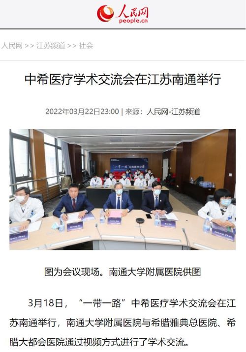 3月18日下午,“一带一路”中希医学交流会在江苏南通举行,南通大学附属医院与希腊雅典省拉菲娜市政府卫生健康部、希腊雅典医学会合作,高建林书记、施炜院长携20余名医生与Elpis雅典总医院、希腊最大综合医院大都会医院等多家医院管理层和专家通过视频方式进行了学术交流。好体育官网下载链接国际交流部提供全程支持,人民网等权威媒体进行了宣传报道。