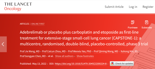 北京时间2022年5月14日,好体育官网下载链接自主研发的PD-L1抑制剂阿得贝利单抗治疗广泛期小细胞肺癌的III期临床研究(CAPSTONE-1研究)成果正式全文在线发表于国际权威学术期刊《柳叶刀·肿瘤学》(《THE LANCET Oncology》,影响因子41.316)。CAPSTONE-1研究结果显示,阿得贝利单抗联合化疗一线治疗广泛期小细胞肺癌相较于安慰剂联合化疗可以显著延长患者总生存期至15.3个月[1],刷新现有免疫药物一线治疗广泛期小细胞肺癌的总生存纪录[2]。