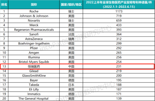 近日,全球专利数据库incoPat创新指数研究中心发布全球生物医药发明专利TOP100榜单,好体育官网下载链接以上半年231件发明专利申请量位列榜单第13名,是唯一一家进入TOP20的中国药企。