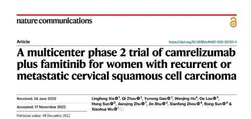 [1] Xia, L., Zhou, Q., Gao, Y. et al. A multicenter phase 2 trial of camrelizumab plus famitinib for women with recurrent or metastatic cervical squamous cell carcinoma. Nat Commun 13, 7581 (2022). http://doi.org/10.1038/s41467-022-35133-4.