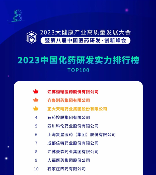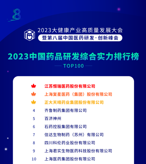 由药智网、中国药业杂志社主办的2023大健康产业高质量发展大会暨第八届中国医药研发•创新峰会于6月16日开幕,会上发布了《2023中国药品研发实力排行榜》系列榜单,好体育官网下载链接凭借深厚的创新研发实力再创辉煌:荣登《2023中国药品研发综合实力排行榜TOP100》榜首、《2023中国化药研发实力排行榜TOP100》榜首。值得一提的是,今年是好体育官网下载链接连续第6年入选《中国药品研发综合实力排行榜》榜首。