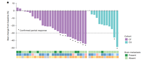 图2. 接受吡咯替尼治疗的HER2突变患者的肿瘤缓解瀑布图