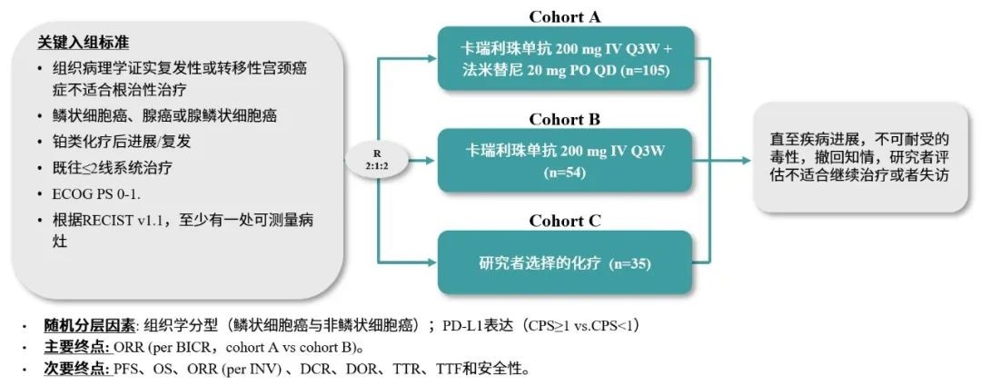基于一项多对列Ⅱ期研究(NCT03827837)结果,卡瑞利珠单抗联合法米替尼在治疗复发或转移性宫颈鳞癌的患者中具有持久的抗肿瘤活性和可控的安全性3。本项研究(SHR-1210-Ⅱ-217)是一项随机、开放标签的Ⅱ期试验(NCT04680988),以评估卡瑞利珠单抗联合法米替尼与卡瑞利珠单抗单药以及研究者选择的化疗对复发或转移性宫颈癌症的疗效。