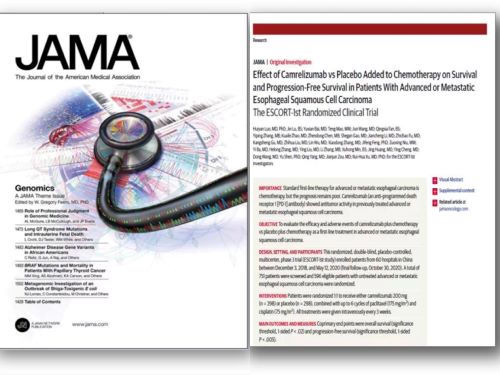 重磅喜讯!美国当地时间2021年9月14日,卡瑞利珠单抗联合化疗一线治疗晚期食管癌的Ⅲ期临床研究(ESCORT-1st)在国际权威杂志、四大顶级医学期刊之一的《美国医学会杂志》(JAMA,2021年影响因子:56.272)全文在线发表。这一重磅喜讯使得ESCORT-1st研究成为全球首项也是唯一一项登上JAMA杂志的食管癌免疫治疗临床研究。