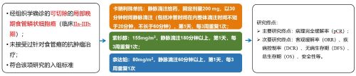 ESPRIT研究—卡瑞利珠单抗联合紫杉醇和奈达铂新辅助治疗局部晚期食管鳞癌的阶段性结果已经被2021年CSCO学术年会收录并进行了口头汇报,在会上马建群教授对这项研究的研究设计及阶段性数据进行了详细的介绍。这是一项单臂、前瞻性、Ⅱ期临床研究,计划招募即将进行手术的70例局部晚期食管鳞癌患者。患者将接受2-4个周期的卡瑞利珠单抗(200 mg,iv,q3w),紫杉醇(155 mg/m2,iv,q3w)和奈达铂(80 mg/m2,iv,q3w)。每2个周期进行疗效评价,用药2-4个周期,由研究者团队对患者进行评估,并对可切除的患者进行手术。主要研究终点是病理完全缓解率(pCR),次要研究终点是客观缓解率(ORR)、疾病控制率(DCR)、无病生存期(DFS)、总生存期(OS)、药物的安全性等(图3)。