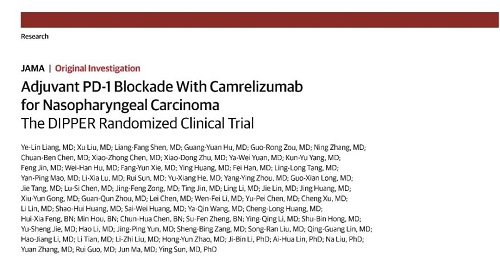 DIPPER研究是一项评估卡瑞利珠单抗辅助治疗高危局部晚期鼻咽癌的开放标签、随机、对照、Ⅲ期临床研究,由中山大学肿瘤防治中心马骏院士、孙颖教授团队牵头开展。继2024年美国临床肿瘤学会(ASCO)年会中以口头报告的形式(摘要号:LBA 6000)公布了研究结果后[1],近日全文发表于《美国医学会杂志》(JAMA,IF:63.1)主刊[2]。