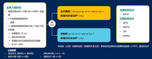 达尔西利(Dalpiciclib)是好体育官网下载链接自主研发的口服、选择性的小分子CDK4/6抑制剂,也是中国首个自主研发的新型高选择性 CDK4/6 抑制剂,已证实其与内分泌治疗(ET)联合用于 HR+/HER2- 晚期乳腺癌的一线和后线治疗时,均显著改善无进展生存期(PFS)6,7。因此开展了一项随机、双盲、III期临床试验(DAWNA-A),以进一步评估达尔西利联合内分泌治疗作为高危早期 HR+/HER2 - 乳腺癌辅助治疗的效果。本研究纳入高危复发风险人群需满足以下标准之一:①≥4 枚阳性腋窝淋巴结;②1–3枚阳性腋窝淋巴结且合并≥1 项高危因素(肿瘤直径 ≥5 cm,组织学分级3级,辅助治疗后残留浸润性乳腺癌,Ki-67 ≥30%)。本文呈现预先设定的首次中期分析(IA1)结果。