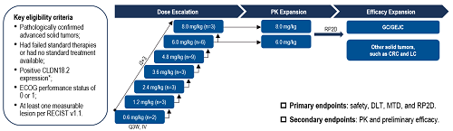 这是一项SHR-A1904在晚期或转移性实体瘤患者中的多中心、剂量爬坡、PK拓展和疗效拓展的I期临床试验。本文报道了SHR-A1904在晚期经治GC/GEJC患者中的研究数据。