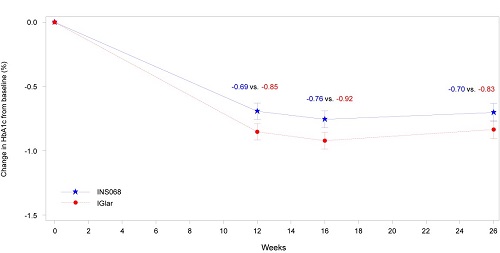 本研究达到预设的主要终点,治疗26周后,INS068组的HbA1c相对基线变化非劣于IGlar组。INS068 组与 IGlar组的HbA1c降幅分别为 1.34% 和 1.36%, 两组差值为 0.02%(95% CI:-0.14%,0.18%)。
