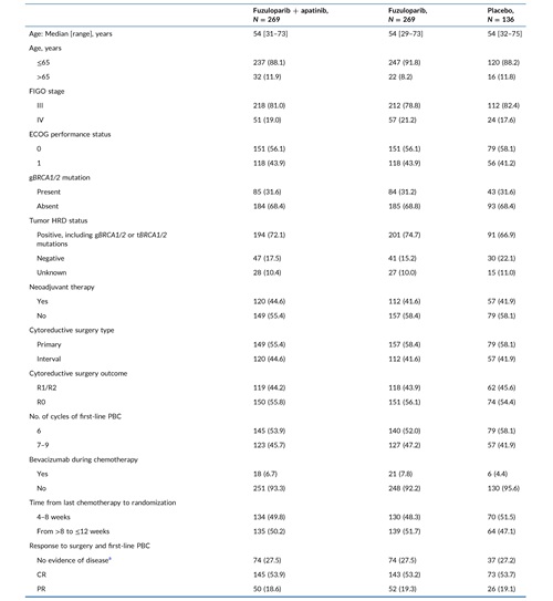 2020年8月27日至2022年4月1日期间,674例患者被纳入研究并按2:2:1的比例随机分配至FZPL+APA组(n=269):氟唑帕利(100 mg BID)+阿帕替尼(375 mg QD)、FZPL组(n=269):氟唑帕利(150 mg BID)或安慰剂组(n=136)进行维持治疗。